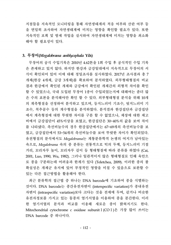 112 지점들을 지속적인 모니터링을 통해 자연생태계의 적응 여부와 산란 여부 등 을 면밀히 조사하여 자연생태계에 미치는 영향을 확인할 필요가 있다. 또한 지속적인 포획 및 방제 작업을 실시하여 자연생태계에 미치는 영향을 최소화 해야 할 필요성이 있다. 3. 무창어 Megalobrama amblycephala Yih 무창어의 공식 수입기록은 2010년 4.62톤을 1회 수입 후 공식적인 수입 기록 은 존재하고 있지 않다. 하지만 한강과 금강일대에서 지속적으로 무창어의 서 식이 확인되어 있어 이에 대해 정밀조사를 실시하였다. 2017년 조사결과 총 7 개체 한강 4개체, 금강 3개체 를 확보하여 분석하였다. 외부형태형질의 비교 결과 한강에서 확인된 개체와 금강에서 확인된 개체간의 외형적 차이를 확인 할 수 있었...