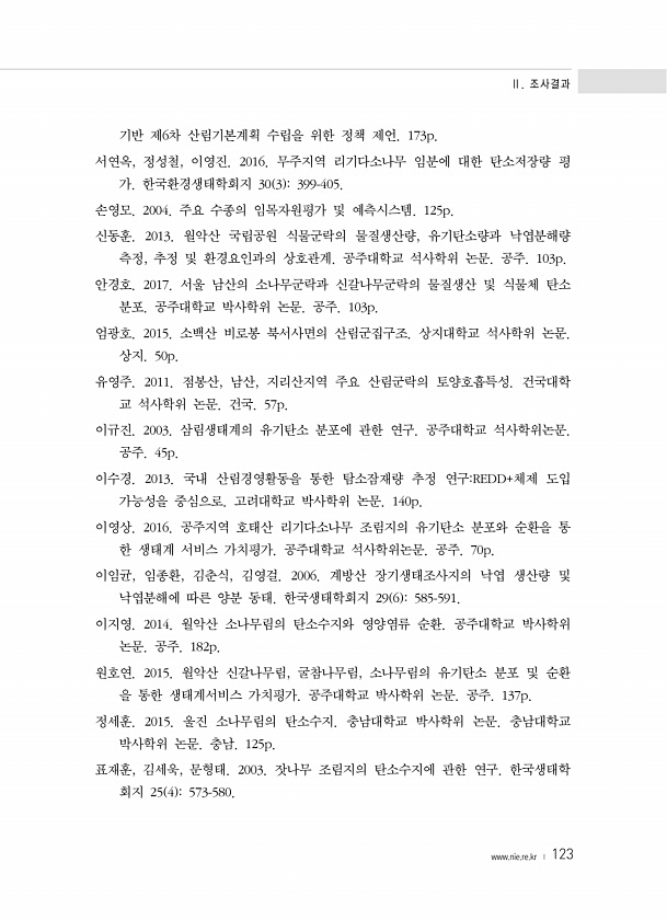 Ⅱ. 조사결과 www.nie.re.kr ? 123 기반 제6차 산림기본계획 수립을 위한 정책 제언. 173p. 서연옥, 정성철, 이영진. 2016. 무주지역 리기다소나무 임분에 대한 탄소저장량 평 가. 한국환경생태학회지 30 3 399-405. 손영모. 2004. 주요 수종의 임목자원평가 및 예측시스템. 125p. 신동훈. 2013. 월악산 국립공원 식물군락의 물질생산량, 유기탄소량과 낙엽분해량 측정, 추정 및 환경요인과의 상호관계. 공주대학교 석사학위 논문. 공주. 103p. 안경호. 2017. 서울 남산의 소나무군락과 신갈나무군락의 물질생산 및 식물체 탄소 분포. 공주대학교 박사학위 논문. 공주. 103p. 엄광호. 2015. 소백산 비로봉 북서사면의 산림군집구조. 상지대학교 석사학위 논문. 상지. 50...