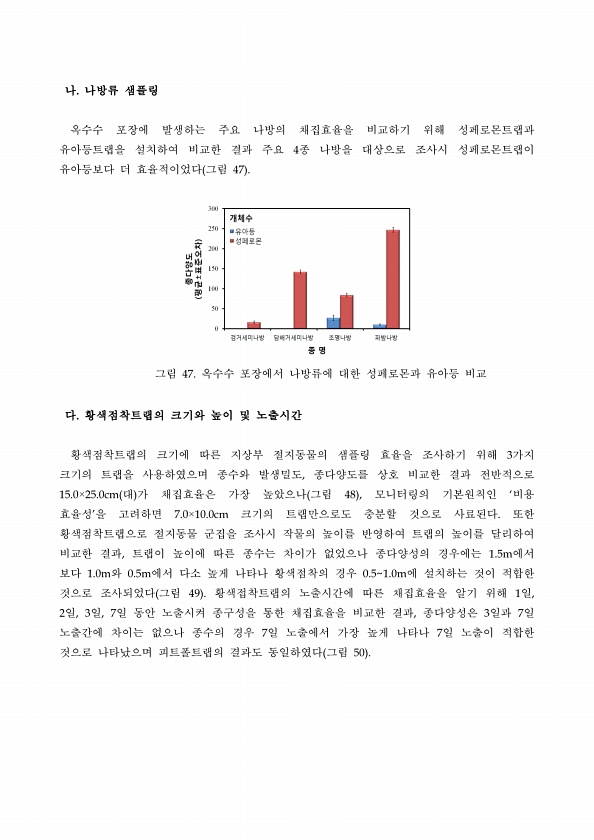 나. 나방류 샘플링 옥수수 포장에 발생하는 주요 나방의 채집효율을 비교하기 위해 성페로몬트랩과 유아등트랩을 설치하여 비교한 결과 주요 4종 나방을 대상으로 조사시 성페로몬트랩이 유아등보다 더 효율적이었다 그림 47 그림 47. 옥수수 포장에서 나방류에 대한 성페로몬과 유아등 비교 다. 황색점착트랩의 크기와 높이 및 노출시간 황색점착트랩의 크기에 따른 지상부 절지동물의 샘플링 효율을 조사하기 위해 3가지 크기의 트랩을 사용하였으며 종수와 발생밀도, 종다양도를 상호 비교한 결과 전반적으로 15.0×25.0cm 대 가 채집효율은 가장 높았으나 그림 48 , 모니터링의 기본원칙인 ‘비용 효율성’을 고려하면 7.0×10.0cm 크기의 트랩만으로도 충분할 것으로 사료된다. 또한 황색점착트랩으로 절지동물 군집을 조사시 ...