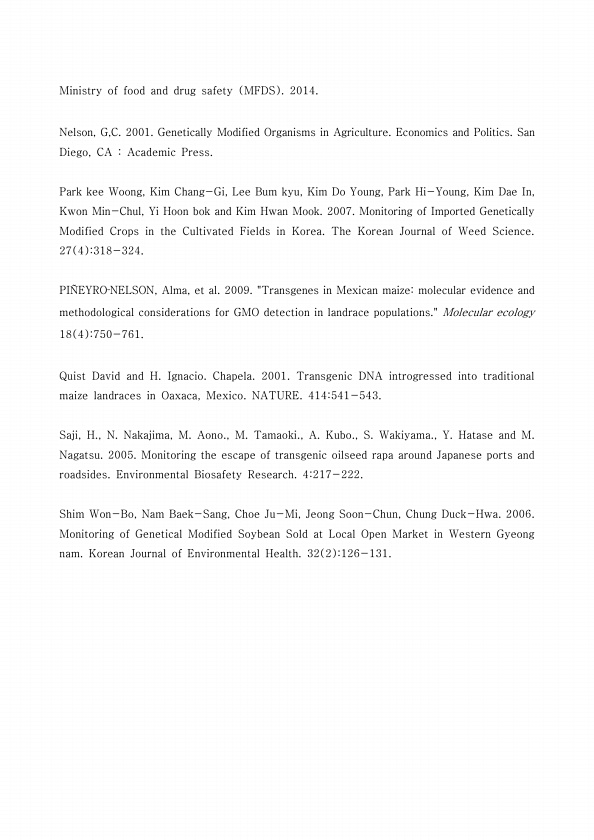 Ministry of food and drug safety MFDS 2014. Nelson, G,C. 2001. Genetically Modified Organisms in Agriculture. Economics and Politics. San Diego, CA Academic Press. Park kee Woong, Kim Chang-Gi, Lee Bum kyu, Kim Do Young, Park Hi-Young, Kim Dae In, Kwon Min-Chul, Yi Hoon bok and Kim Hwan Mook. 2007. Monitoring of Imported Genetically Modified Crops in the Cultivated Fields in Korea. The Korean Jour...