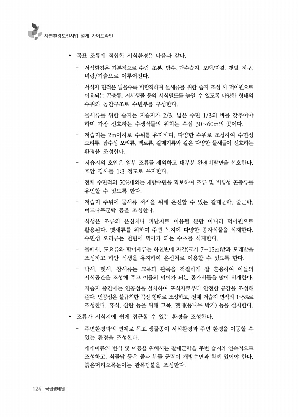 124 국립생태원 자연환경보전사업 설계 가이드라인 목표 조류에 적합한 서식환경은 다음과 같다. ? 서식환경은 기본적으로 수림, 초본, 담수, 담수습지, 모래/자갈, 갯벌, 하구, 벼랑/기슭으로 이루어진다. ? 서식지 면적은 넓을수록 바람직하며 물새류를 위한 습지 조성 시 먹이원으로 이용되는 곤충류, 저서생물 등의 서식밀도를 높일 수 있도록 다양한 형태의 수위와 공간구조로 수변부를 구성한다. ? 물새류를 위한 습지는 저습지가 2/3, 넓은 수면 1/3의 비를 갖추어야 하며 가장 선호하는 수생식물의 위치는 수심 30∼60㎝의 곳이다. ? 저습지는 2m이하로 수위를 유지하며, 다양한 수위로 조성하여 수면성 오리류, 잠수성 오리류, 백로류, 갈매기류와 같은 다양한 물새들이 선호하는 환경을 조성한다. ? 저습지의 호...
