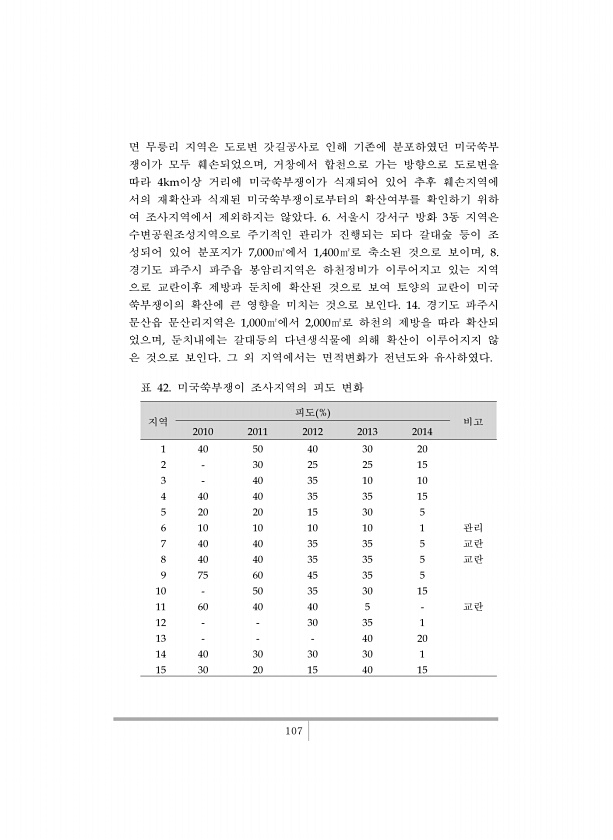107 면 무릉리 지역은 도로변 갓길공사로 인해 기존에 분포하였던 미국쑥부 쟁이가 모두 훼손되었으며, 거창에서 합천으로 가는 방향으로 도로변을 따라 4km이상 거리에 미국쑥부쟁이가 식재되어 있어 추후 훼손지역에 서의 재확산과 식재된 미국쑥부쟁이로부터의 확산여부를 확인하기 위하 여 조사지역에서 제외하지는 않았다. 6. 서울시 강서구 방화 3동 지역은 수변공원조성지역으로 주기적인 관리가 진행되는 되다 갈대숲 등이 조 성되어 있어 분포지가 7,000㎡에서 1,400㎡로 축소된 것으로 보이며, 8. 경기도 파주시 파주읍 봉암리지역은 하천정비가 이루어지고 있는 지역 으로 교란이후 제방과 둔치에 확산된 것으로 보여 토양의 교란이 미국 쑥부쟁이의 확산에 큰 영향을 미치는 것으로 보인다. 14. 경기도 파주시 문산읍 문산...