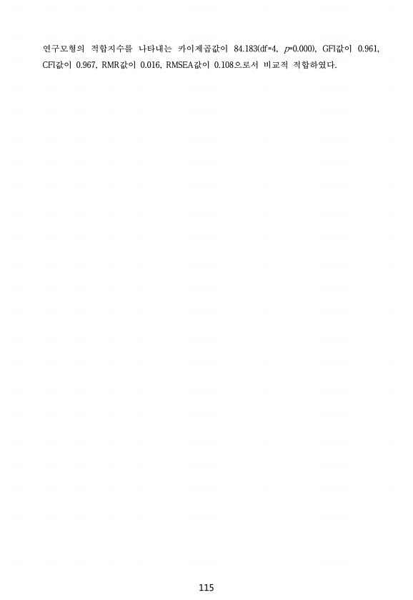 115 연구모형의 적합지수를 나타내는 카이제곱값이 84.183 df=4, p=0.000 , GFI값이 0.961, CFI값이 0.967, RMR값이 0.016, RMSEA값이 0.108으로서 비교적적합하였다.
