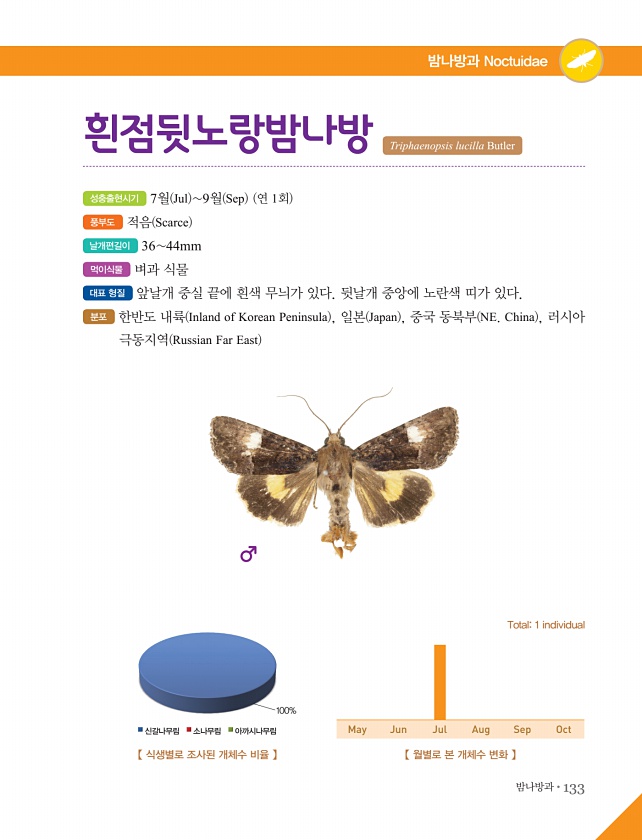 밤나방과?133 밤나방과 Noctuidae 성충출현시기 7월 Jul 9월 Sep 연 1회 풍부도 적음 Scarce 날개편길이 3644mm 먹이식물 벼과 식물 대표 형질 앞날개 중실 끝에 흰색 무늬가 있다. 뒷날개 중앙에 노란색 띠가 있다. 분포 한반도 내륙 Inland of Korean Peninsula , 일본 Japan , 중국 동북부 NE. China , 러시아 극동지역 Russian Far East 흰점뒷노랑밤나방 Triphaenopsis lucilla Butler 【 월별로 본 개체수 변화 】 Total1 individual May Jun Jul Aug Sep Oct 【 식생별로 조사된 개체수 비율 】 100% 신갈나무림 소나무림아까시나무림
