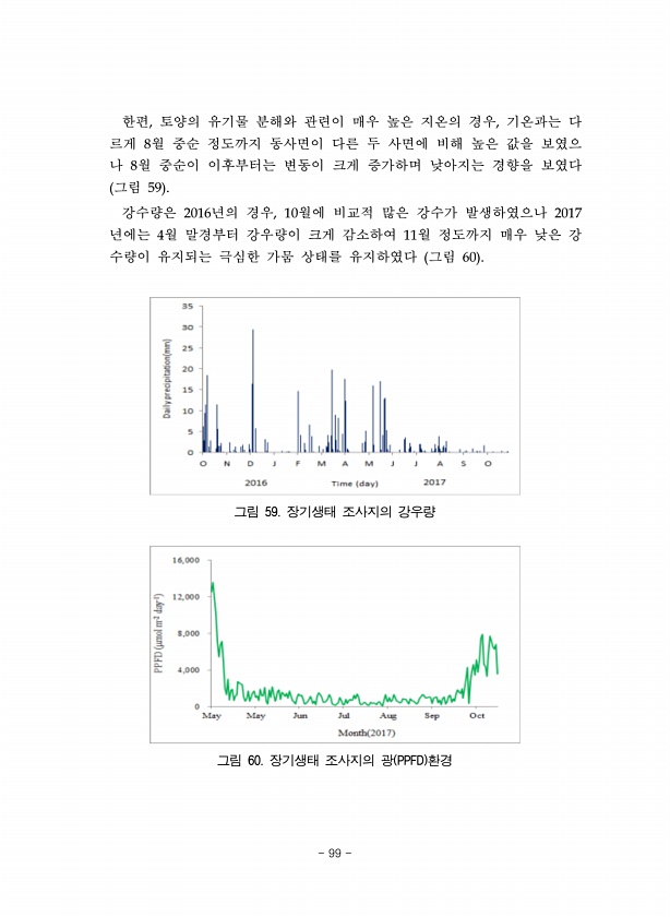 한편, 토양의 유기물 분해와 관련이 매우 높은 지온의 경우, 기온과는 다 르게 8월 중순 정도까지 동사면이 다른 두 사면에 비해 높은 값을 보였으 나 8월 중순이 이후부터는 변동이 크게 증가하며 낮아지는 경향을 보였다 그림 59 강수량은 2016년의 경우, 10월에 비교적 많은 강수가 발생하였으나 2017 년에는 4월 말경부터 강우량이 크게 감소하여 11월 정도까지 매우 낮은 강 수량이 유지되는 극심한 가뭄 상태를 유지하였다 그림 60 그림 59. 장기생태 조사지의 강우량 그림 60. 장기생태 조사지의 광 PPFD 환경 99