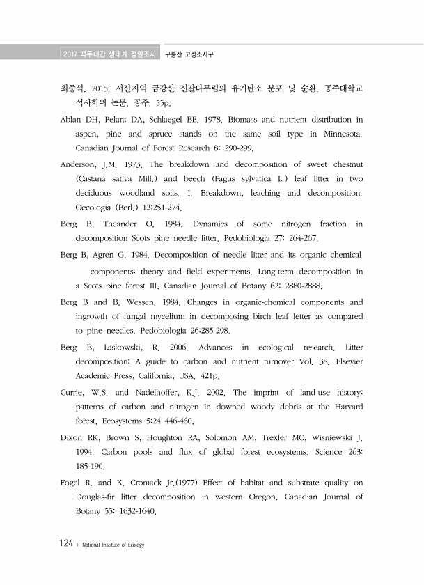 2017 백두대간 생태계 정밀조사 구룡산 고정조사구 124 ? National Institute of Ecology 최중석. 2015. 서산지역 금강산 신갈나무림의 유기탄소 분포 및 순환. 공주대학교 석사학위 논문. 공주. 55p. Ablan DH, Pelara DA, Schlaegel BE. 1978. Biomass and nutrient distribution in aspen, pine and spruce stands on the same soil type in Minnesota. Canadian Journal of Forest Research 8290-299. Anderson, J.M. 1973. The breakdown and decomposition of sweet chestnut Castana s...