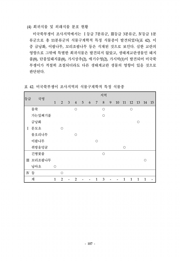 107 4 희귀식물 및 외래식물 분포 현황 미국쑥부쟁이 조사지역에서는 Ⅰ등급 7분류군, Ⅲ등급 3분류군, Ⅳ등급 1분 류군으로 총 11분류군의 식물구계학적 특정 식물종이 발견되었다 표 42 이 중 금낭화, 이팝나무, 꼬리조팝나무 등은 식재된 것으로 보인다. 심한 교란의 영향으로 그밖에 특별한 희귀식물은 발견되지 않았고, 생태계교란생물인 돼지 풀 8 , 단풍잎돼지풀 8 , 가시상추 2 , 애기수영 2 , 가시박 1 이 발견되어 미국쑥 부쟁이가 적절히 조절되더라도 다른 생태계교란 생물의 영향이 있을 것으로 판단된다. 등급 국명 지역 1 2 3 4 5 6 7 8 9 10 11 12 13 14 15 Ⅰ 물쑥 ○ ○ ○ 가는잎쐐기풀 ○ 금낭화 ○ 문모초 ○ 물오리나무 ○ 이팝나무 ○ 쥐방울덩굴 ○ Ⅲ 긴병꽃풀 ○ 꼬...