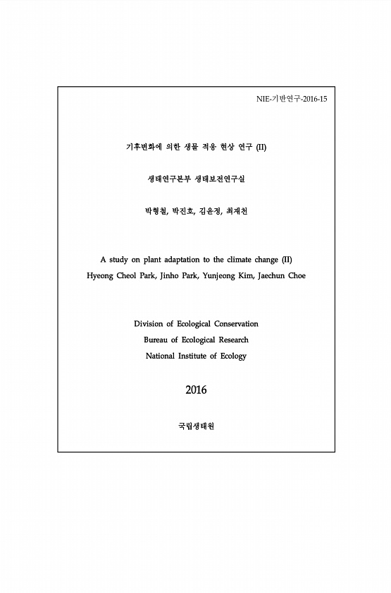 NIE-기반연구-2016-15 기후변화에 의한 생물 적응 현상 연구 II 생태연구본부 생태보전연구실 박형철, 박진호, 김윤정, 최재천 A study on plant adaptation to the climate change II Hyeong Cheol Park, Jinho Park, Yunjeong Kim, Jaechun Choe Division of Ecological Conservation Bureau of Ecological Research National Institute of Ecology 2016국립생태원