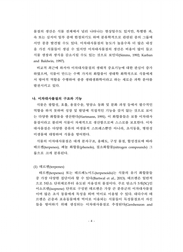4 물질의 생산은 식물 전체에서 널리 나타나는 현상일수도 있지만, 특별한 과, 속 또는 심지어 일부 종에 한정되기도 하며 분류학적으로 관련된 종의 그룹에 서만 종종 발견될 수도 있다. 이차대사물질의 농도가 높을수록 더 많은 내성 을 가진 식물들이 생길 수 있지만 이차대사물질의 생산은 비용이 많이 들고 식물 생장과 생식을 감소시킬 수도 있는 것으로 보인다 Simms, 1992; Karban and Baldwin, 1997 비교적 최근에 와서야 이차대사물질의 생태적 중요기능에 대한 관심이 증가 하였으며, 식물이 만드는 수백 가지의 화합물이 생태학 화학적으로 식물에게 서 방어적 역할을 수행하여 종종 생태생화학이라고 하는 새로운 과학 분야를 발전시키고 있다. 나. 이차대사물질의 구조와 기능 식물은 광합성, 호흡, ...