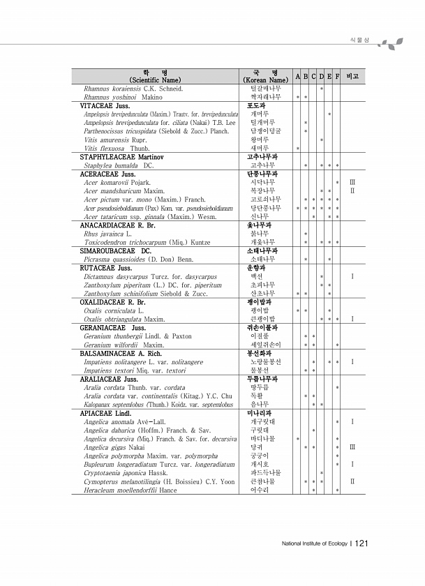 식 물 상 National Institute of EcologyⅠ121 학 명 Scientific Name 국 명 Korean Name A B C D E F 비고 Rhamnus koraiensis C.K. Schneid. 털갈매나무 * Rhamnus yoshinoi Makino 짝자래나무 * * VITACEAE Juss. 포도과 Ampelopsis brevipedunculata Maxim. Trautv. for. brevipedunculata 개머루 * Ampelopsis brevipedunculata for. ciliata Nakai T.B. Lee 털개머루 * Parthenocissus tricuspidata Siebold & Zucc. Planch. 담쟁이덩굴 * Vitis amurensis Rupr....