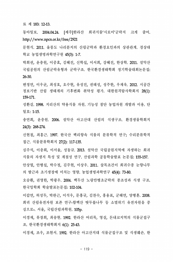 119 료 제 동아일보 제주 한라산 희귀식물 시로미 군락지 크게 줄어 문현식 울릉도 나리분지의 산림군락과 환경요인과의 상관관계 경상대 학교 농업생명과학연구원 박희권 윤충원 이중효 김혜진 신학섭 이서희 강혜진 한상학 설악산 국립공원의 산림군락유형과 군락구조 한국환경생태학회 정기학술대회논문집 변정연 이우균 최성호 오수현 유성진 권태성 성주한 우재욱 시공간 정보기반 산림 생태계의 기후변화 취약성 평가 대한원격탐사학회지 성환길 지리산의 약용식물 자원 기능성 첨단 농업자원 개발과 이용 단 일호 송연희 윤충원 설악산 아고산대 산림의 식생구조 환경생물학회지 신현철 최홍근 한국산 백리향속 식물의 분류학적 연구 수리분류학적 접근 식물분류학회지 심주석 이충희 이서율 성동규 설악산 국립공원지역에 자생하는 희귀 식물의 자생지 특...
