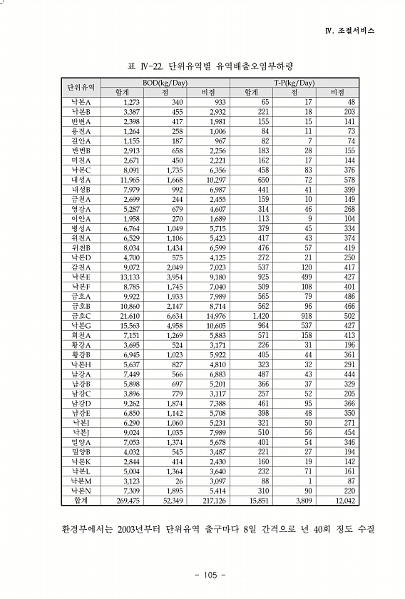 Ⅳ. 조절서비스 105 단위유역 BOD kg/Day T-P kg/Day 합계 점 비점 합계 점 비점 낙본A 1,273 340 933 65 17 48 낙본B 3,387 455 2,932 221 18 203 반변A 2,398 417 1,981 155 15 141 용전A 1,264 258 1,006 84 11 73 길안A 1,155 187 967 82 7 74 반변B 2,913 658 2,256 183 28 155 미천A 2,671 450 2,221 162 17 144 낙본C 8,091 1,735 6,356 458 83 376 내성A 11,965 1,668 10,297 650 72 578 내성B 7,979 992 6,987 441 41 399 금천A 2,699 244 2,455 159 10 149 영강A 5,28...