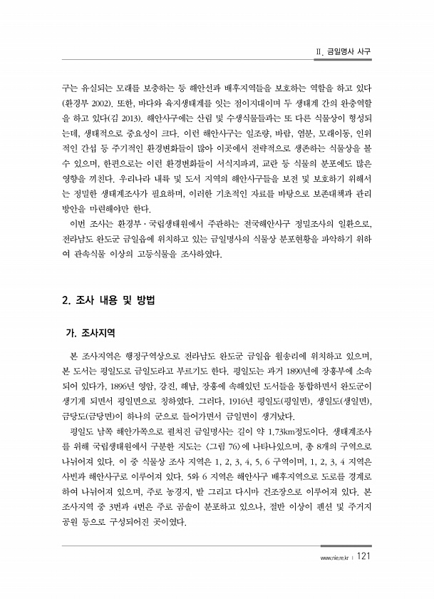 Ⅱ. 금일명사 사구 www.nie.re.kr ? 121 구는 유실되는 모래를 보충하는 등 해안선과 배후지역들을 보호하는 역할을 하고 있다 환경부 2002 또한, 바다와 육지생태계를 잇는 점이지대이며 두 생태계 간의 완충역할 을 하고 있다 김 2013 해안사구에는 산림 및 수생식물들과는 또 다른 식물상이 형성되 는데, 생태적으로 중요성이 크다. 이런 해안사구는 일조량, 바람, 염분, 모래이동, 인위 적인 간섭 등 주기적인 환경변화들이 많아 이곳에서 전략적으로 생존하는 식물상을 볼 수 있으며, 한편으로는 이런 환경변화들이 서식지파괴, 교란 등 식물의 분포에도 많은 영향을 끼친다. 우리나라 내륙 및 도서 지역의 해안사구들을 보전 및 보호하기 위해서 는 정밀한 생태계조사가 필요하며, 이러한 기초적인 자료를 바탕으로...
