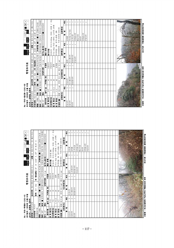 No 지리-덕평봉-1101-01 조사일자 2018년 11월 01일 조사자 김한결, 김?? 현장조사표 군락명신갈나무군락 조사지역경남 하동군 화개면 대성리 산 4 유형□ 대조지 N □ 훼손지 D 식생상관아고산 낙엽활엽수림 면적10× 10㎡ 위·경도 GPS 35° 19′ 14.82″ N, 127° 39′ 56.35″ E 해발1440m 지형□산정■능선■사면 ■상□중□하 □계곡□평지 미세지형■평면 □돌출 □함몰 □요철 방위225° 토양■ 갈색삼림토 □적황색삼림토 □암적색삼림토 □회갈색삼림토 □침식토 □미숙토 □암쇄토 경사19° 경도낙엽부식층2.5 cm 암석노출 % □≥51□ 50 ■ 25□ 5□0 층위구분 높이 m 식피율 % 우점종 훼손 유형교 목 층 T1 9-11 55 신갈나무 특기사항조릿대 80% 구상나무 치수 ...