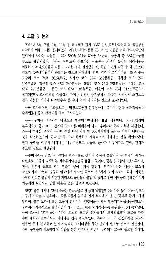 Ⅱ. 조사결과 www.nie.re.kr ? 123 4. 고찰 및 논의 2018년 5월, 7월, 9월, 10월 등 총 4회에 걸쳐 DMZ 일원 중부산악권역 의 식물상을 파악하기 위해 조사를 실시하였다. 가능한 확증표본을 근거로 한 민통선 이북 중부산악권역 일대에서 자라는 식물은 112과 380속 611종 8아종 68변종 1품종의 총 688분류군인 것으로 확인되었다. 따라서 한반도에 분포하는 식물종은 최근에 유입된 외래식물을 비롯하여 약 4,500종의 식물이 자라는 점을 감안했을 때, 한반도 전체 식물 중 약 15.28% 정도가 중부산악권역에 분포하는 것으로 나타났다. 한편, 각각의 조사지역별 식물종 수는 도창리 코스 74과 262분류군, 성재산 코스 87과 369분류군, 대성산 코스 89과 391분류군, 적근...