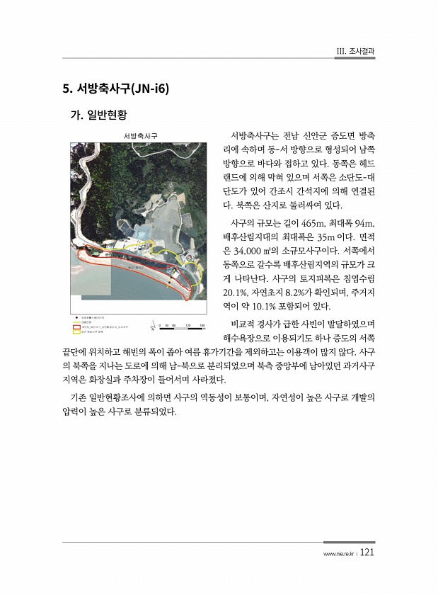 III. 조사결과 www.nie.re.kr ?121 5. JN-i6 서방축사구는 전남 신안군 증도면 방축 리에 속하며 동-서 방향으로 형성되어 남쪽 방향으로 바다와 접하고 있다. 동쪽은 헤드 랜드에 의해 막혀 있으며 서쪽은 소단도-대 단도가 있어 간조시 간석지에 의해 연결된 다. 북쪽은 산지로 둘러싸여 있다. 사구의 규모는 길이 465m, 최대폭 94m, 배후산림지대의 최대폭은 35m 이다. 면적 은 34,000 ㎡의 소규모사구이다. 서쪽에서 동쪽으로 갈수록 배후산림지역의 규모가 크 게 나타난다. 사구의 토지피복은 침엽수림 20.1%, 자연초지 8.2%가 확인되며, 주거지 역이 약 10.1% 포함되어 있다. 비교적 경사가 급한 사빈이 발달하였으며 해수욕장으로 이용되기도 하나 증도의 서쪽 끝단에 위치하고 해빈...