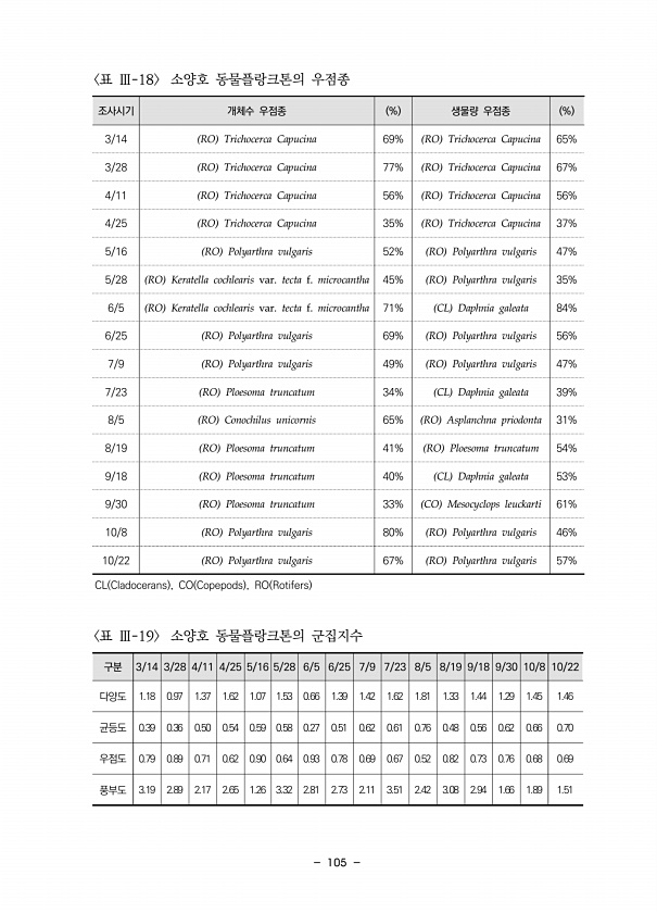 105 조사시기 개체수 우점종 % 생물량 우점종 % 3/14 RO Trichocerca Capucina 69% RO Trichocerca Capucina 65% 3/28 RO Trichocerca Capucina 77% RO Trichocerca Capucina 67% 4/11 RO Trichocerca Capucina 56% RO Trichocerca Capucina 56% 4/25 RO Trichocerca Capucina 35% RO Trichocerca Capucina 37% 5/16 RO Polyarthra vulgaris 52% RO Polyarthra vulgaris 47% 5/28 RO Keratella cochlearis var. tecta f. microcantha 45% RO Polyar...
