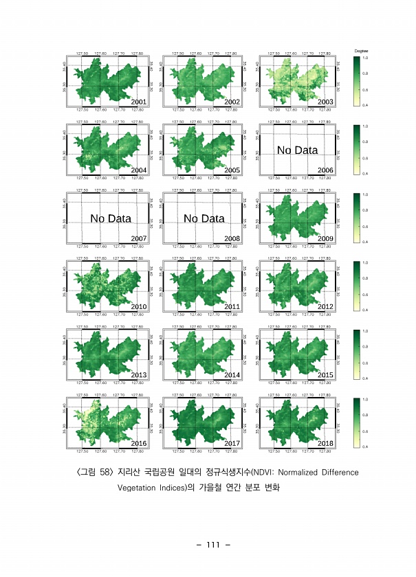 111 그림 58 지리산 국립공원 일대의 정규식생지수 NDVINormalized Difference Vegetation Indices 의 가을철 연간 분포변화