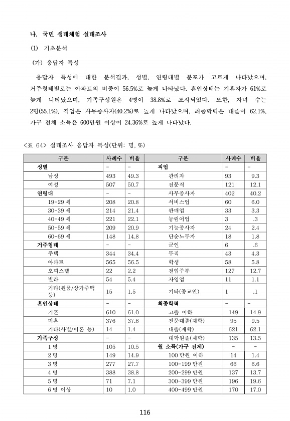 116 나. 국민 생태체험 실태조사 1 기초분석 가 응답자 특성 응답자 특성에 대한 분석결과, 성별, 연령대별 분포가 고르게 나타났으며, 거주형태별로는 아파트의 비중이 56.5%로 높게 나타났다. 혼인상태는 기혼자가 61%로 높게 나타났으며, 가족구성원은 4명이 38.8%로 조사되었다. 또한, 자녀 수는 2명 55.1% , 직업은 사무종사자 40.2% 로 높게 나타났으며, 최종학력은 대졸이 62.1%, 가구 전체 소득은 600만원 이상이 24.36%로 높게 나타났다. 표 64 실태조사 응답자 특성 단위명, % 구분 사례수 비율 구분 사례수 비율 성별 직업 남성 493 49.3 관리자 93 9.3 여성 507 50.7 전문직 121 12.1 연령대 사무종사자 402 40.2 19-29 세 208 20.8 서비...