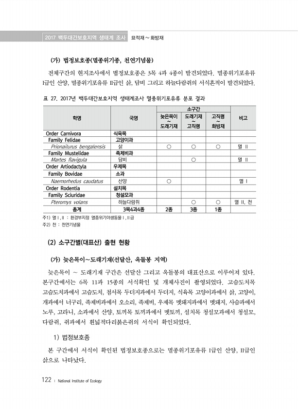 2017 백두대간보호지역 생태계 조사 묘적재 화방재 122 ? National Institute of Ecology 가 법정보호종 멸종위기종, 천연기념물 전체구간의 현지조사에서 볍정보호종은 3목 4과 4종이 발견되었다. 멸종위기포유류 I급인 산양, 멸종위기포유류 II급인 삵, 담비 그리고 하늘다람쥐의 서식흔적이 발견되었다. 학명 국명 소구간 늦은목이 비고 ∼ 도래기재 도래기재 ∼ 고직령 고직령 ∼ 화방재 Order Carnivora 식육목 Family Felidae 고양이과 Prionailurus bengalensis 삵 ○ ○ ○ 멸 Ⅱ Family Mustelidae 족제비과 Martes flavigula 담비 ○ 멸 Ⅱ Order Artiodactyla 우제목 Family Bovidae 소과 Naemo...