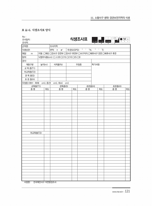 iii. 소황사구 생태·경관보전지역의 식생 www.nie.re.kr ?121 No 조사일자 조사자식생조사표 군락명조사지역식생상관면적× ㎡ 위?경도 GPS ° ′ ″N, ° ′ E 해발m 지형□해빈 □전사구 전면부 □전사구 후면부 □사구저지 □배후사구 전면 □배후사구 후면 방위낙엽부식층 cm □.≥20 □ 15 □ 10 □ 5 □0 경사계층구분 높이 m 식피율 % 우점종 특기사항교 목 층 T1 아교목층 T2 관 목 층 S 초 본 층 H 우점종 DBH 최대 cm , 중간 cm , 최소 cm 교목층 T1 관목층 S 초본층 H 초본층 H 종 명 피도 종 명 피도 종 명 피도 종 명 피도 아교목층 T2 사업명 전국해안사구 자연환경조사 표 ⅲ-6. 식생조사표양식