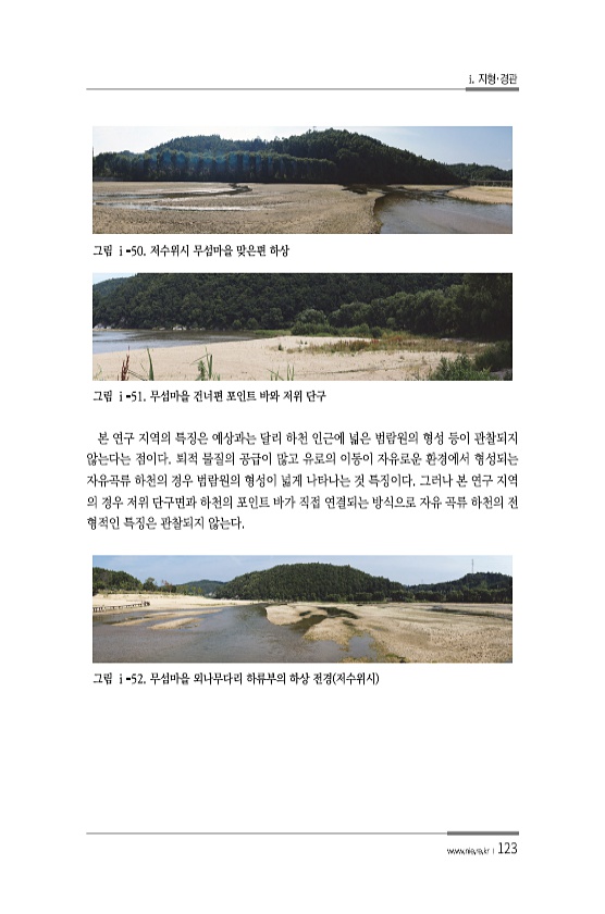 i. 지형·경관 www.nie.re.kr ?123 그림 ⅰ-50. 저수위시 무섬마을 맞은편 하상 그림 ⅰ-51. 무섬마을 건너편 포인트 바와 저위 단구 본 연구 지역의 특징은 예상과는 달리 하천 인근에 넓은 범람원의 형성 등이 관찰되지 않는다는 점이다. 퇴적 물질의 공급이 많고 유로의 이동이 자유로운 환경에서 형성되는 자유곡류 하천의 경우 범람원의 형성이 넓게 나타나는 것 특징이다. 그러나 본 연구 지역 의 경우 저위 단구면과 하천의 포인트 바가 직접 연결되는 방식으로 자유 곡류 하천의 전 형적인 특징은 관찰되지 않는다. 그림 ⅰ-52. 무섬마을 외나무다리 하류부의 하상 전경 저수위시