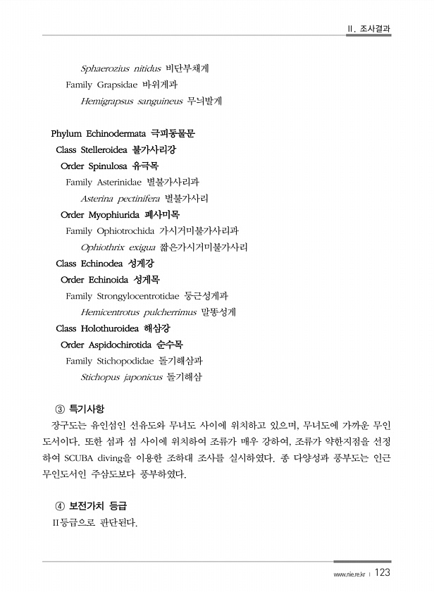 Ⅱ. 조사결과 www.nie.re.kr ? 123 Sphaerozius nitidus 비단부채게 Family Grapsidae 바위게과 Hemigrapsus sanguineus 무늬발게 Phylum Echinodermata 극피동물문 Class Stelleroidea 불가사리강 Order Spinulosa 유극목 Family Asterinidae 별불가사리과 Asterina pectinifera 별불가사리 Order Myophiurida 폐사미목 Family Ophiotrochida 가시거미불가사리과 Ophiothrix exigua 짧은가시거미불가사리 Class Echinodea 성게강 Order Echinoida 성게목 Family Strongylocentrotidae 둥근성게과 Hemicentrotus ...