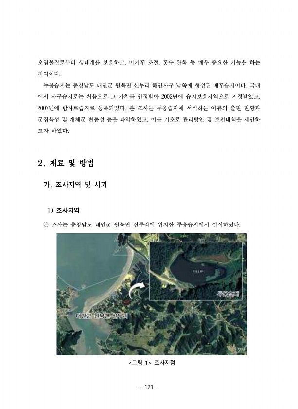 121 오염물질로부터 생태계를 보호하고, 미기후 조절, 홍수 완화 등 매우 중요한 기능을 하는 지역이다. 두웅습지는 충청남도 태안군 원북면 신두리 해안사구 남쪽에 형성된 배후습지이다. 국내 에서 사구습지로는 처음으로 그 가치를 인정받아 2002년에 습지보호지역으로 지정받았고, 2007년에 람사르습지로 등록되었다. 본 조사는 두웅습지에 서식하는 어류의 출현 현황과 군집특성 및 개체군 변동성 등을 파악하였고, 이를 기초로 관리방안 및 보전대책을 제안하 고자 하였다. 2. 재료 및 방법 가. 조사지역 및 시기 1 조사지역 본 조사는 충청남도 태안군 원북면 신두리에 위치한 두웅습지에서 실시하였다. 그림 1조사지점
