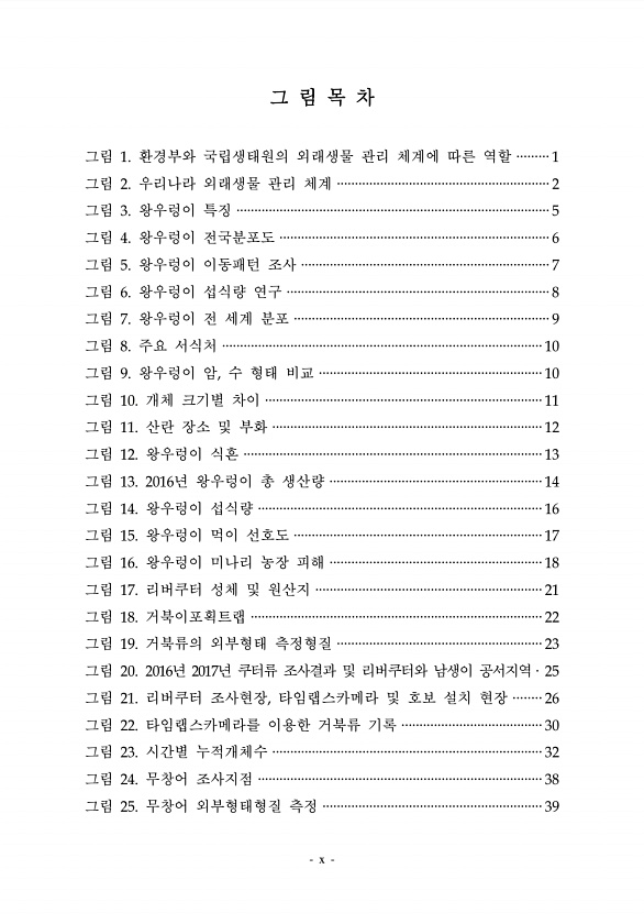 x 그 림 목 차 그림 1. 환경부와 국립생태원의 외래생물 관리 체계에 따른 역할 ·········1 그림 2. 우리나라 외래생물 관리 체계 ···························································2 그림 3. 왕우렁이 특징 ·······················································································5 그림 4. 왕우렁이 전국분포도 ···········································································6 그림 5. 왕우렁이 이동패턴 조사 ············································...