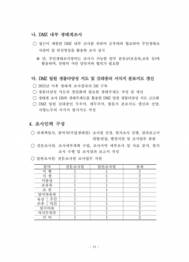 15 제5차 전국자연환경조사 지침 하였다. 제?차?전국자연환경조사는 ?차?조사에서?나타난?문제점을?보완하는?휴지기를?가진?후 ????년부터 ????년까지 ?년에? 걸쳐? 수행되었다. ?차? 조사에서? 생태계? 상황을? 파악 하는데?주력하였다면, ?차?조사에서는?전국의?지형경관, 식생?및?동·식물의?분포현황을 체계적으로?조사하여?자연환경정책을?위한?자료를?확보하고, 국토?관리의?기본이?되는 생태·자연도를?작성하는?것을?목적으로?하였다. 조사권역은?육상지역과?해안지역으로?이원화하여?구획하였다. 육상지역은?전국을?자연 · 생태적?특성, 산줄기와?하천의?분포, 지역의?크기?및?상호?연계성?등을?고려하여 ??개 대권역과 ???개?소권역으로?구분하였으며, ?개?소권역은 ??개의?평가단위로?세분하고 이?중?해당?소권역을...