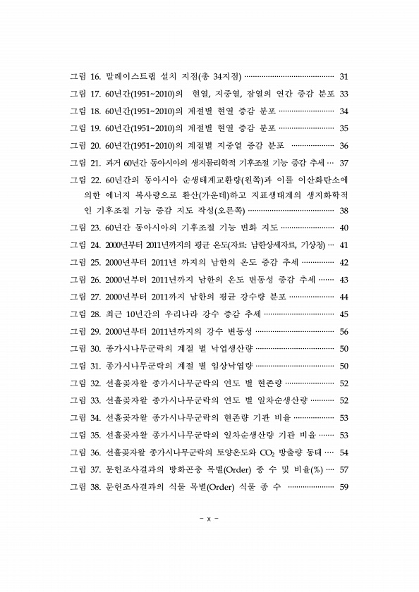 x 그림 16. 말레이스트랩 설치 지점 총 34지점 ·········································· 31 그림 17. 60년간 19512010 의 현열, 지중열, 잠열의 연간 증감 분포 33 그림 18. 60년간 19512010 의 계절별 현열 증감 분포 ·························· 34 그림 19. 60년간 19512010 의 계절별 현열 증감 분포 ·························· 35 그림 20. 60년간 19512010 의 계절별 지중열 증감 분포 ···················· 36 그림 21. 과거 60년간 동아시아의 생지물리학적 기후조절 기능 증감 추세 ··· 37 그림 22. 60년간의 동아시아 순생태계교환량 왼쪽 과 이를 이...