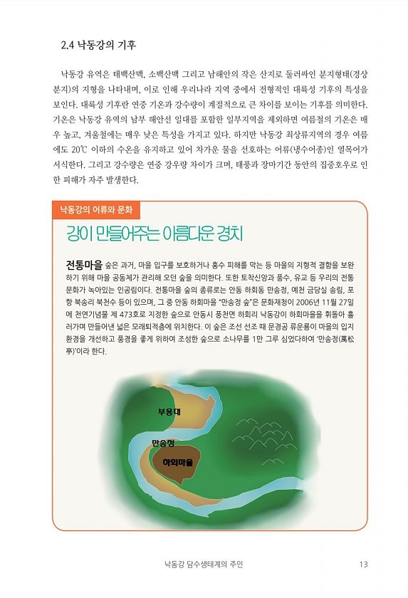 낙동강 담수생태계의 주인 13 2.4 낙동강의 기후 낙동강 유역은 태백산맥, 소백산맥 그리고 남해안의 작은 산지로 둘러싸인 분지형태 경상 분지 의 지형을 나타내며, 이로 인해 우리나라 지역 중에서 전형적인 대륙성 기후의 특성을 보인다. 대륙성 기후란 연중 기온과 강수량이 계절적으로 큰 차이를 보이는 기후를 의미한다. 기온은 낙동강 유역의 남부 해안선 일대를 포함한 일부지역을 제외하면 여름철의 기온은 매 우 높고, 겨울철에는 매우 낮은 특성을 가지고 있다. 하지만 낙동강 최상류지역의 경우 여름 에도 20℃ 이하의 수온을 유지하고 있어 차가운 물을 선호하는 어류 냉수어종 인 열목어가 서식한다. 그리고 강수량은 연중 강우량 차이가 크며, 태풍과 장마기간 동안의 집중호우로 인 한 피해가 자주 발생한다. 낙동강의 어...