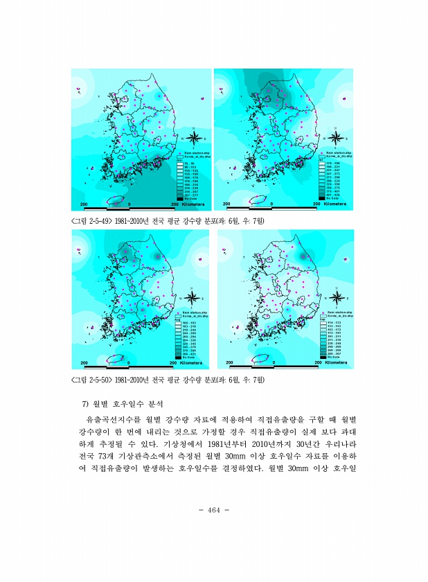 464 그림 2-5-49 19812010년 전국 평균 강수량 분포 좌6월, 우7월 그림 2-5-50 19812010년 전국 평균 강수량 분포 좌6월, 우7월 7 월별 호우일수 분석 유출곡선지수를 월별 강수량 자료에 적용하여 직접유출량을 구할 때 월별 강수량이 한 번에 내리는 것으로 가정할 경우 직접유출량이 실제 보다 과대 하게 추정될 수 있다. 기상청에서 1981년부터 2010년까지 30년간 우리나라 전국 73개 기상관측소에서 측정된 월별 30mm 이상 호우일수 자료를 이용하 여 직접유출량이 발생하는 호우일수를 결정하였다. 월별 30mm 이상호우일