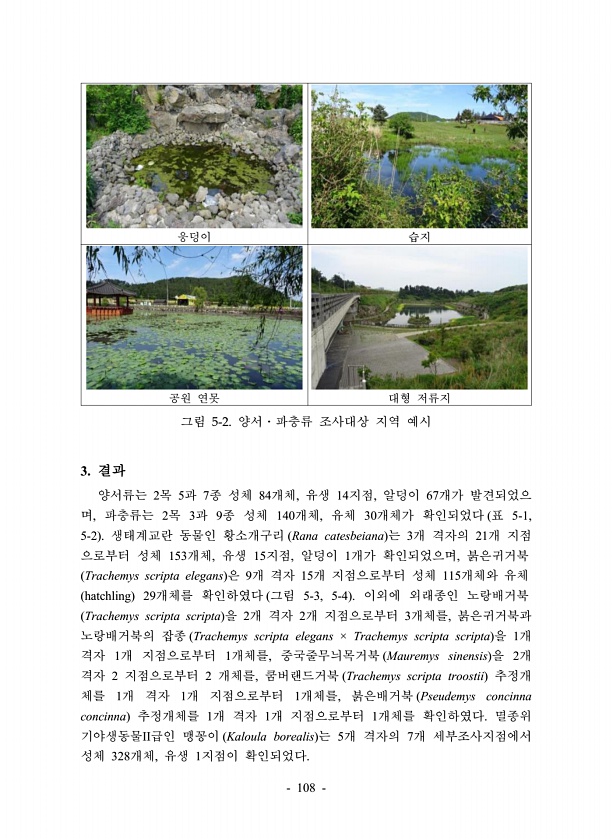 108 웅덩이 습지 공원 연못 대형 저류지 그림 5-2. 양서?파충류 조사대상 지역 예시 3. 결과 양서류는 2목 5과 7종 성체 84개체, 유생 14지점, 알덩이 67개가 발견되었으 며, 파충류는 2목 3과 9종 성체 140개체, 유체 30개체가 확인되었다 표 5-1, 5-2 생태계교란 동물인 황소개구리 Rana catesbeiana 는 3개 격자의 21개 지점 으로부터 성체 153개체, 유생 15지점, 알덩이 1개가 확인되었으며, 붉은귀거북 Trachemys scripta elegans 은 9개 격자 15개 지점으로부터 성체 115개체와 유체 hatchling 29개체를 확인하였다 그림 5-3, 5-4 이외에 외래종인 노랑배거북 Trachemys scripta scripta 을 2개 격자 2개 지점으로부...