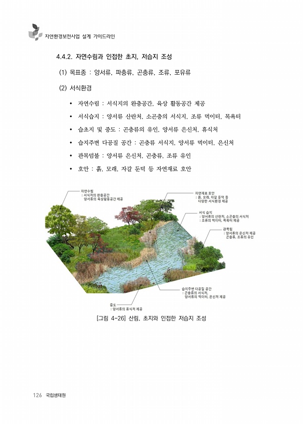 126 국립생태원 자연환경보전사업 설계 가이드라인 4.4.2. 자연수림과 인접한 초지, 저습지 조성 1 목표종 양서류, 파충류, 곤충류, 조류, 포유류 2 서식환경 자연수림 서식지의 완충공간, 육상 활동공간 제공 서식습지 양서류 산란처, 소곤충의 서식지, 조류 먹이터, 목욕터 습초지 및 중도 곤충류의 유인, 양서류 은신처, 휴식처 습지주변 다공질 공간 곤충류 서식지, 양서류 먹이터, 은신처 관목덤불 양서류 은신처, 곤충류, 조류 유인 호안 흙, 모래, 자갈 둔덕 등 자연재료 호안 [그림 4-26] 산림, 초지와 인접한 저습지조성