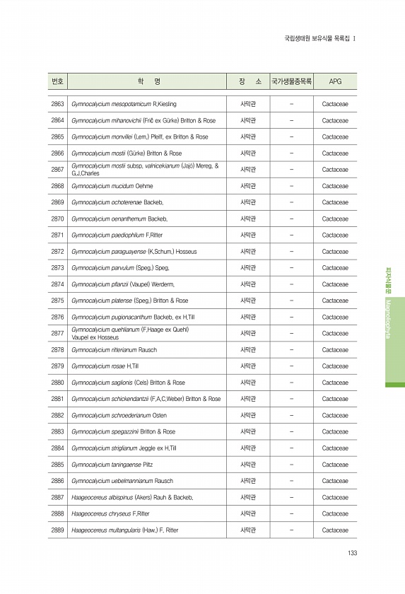 133 번호 학 명 장 소 국가생물종목록 APG 피자식물문 Magnoliophyta 국립생태원 보유식물 목록집 Ⅰ 2863 Gymnocalycium mesopotamicum R.Kiesling 사막관 Cactaceae 2864 Gymnocalycium mihanovichii Fri? ex G?rke Britton & Rose 사막관 Cactaceae 2865 Gymnocalycium monvillei Lem. Pfeiff. ex Britton & Rose 사막관 Cactaceae 2866 Gymnocalycium mostii G?rke Britton & Rose 사막관 Cactaceae 2867 Gymnocalycium mostii subsp. valnicekianum Jaj? Mereg. & G.J.Cha...