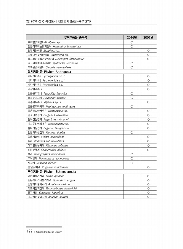 2016 전국 특정도서 정밀조사 옹진-북부권역 122 ? National Institute of Ecology 무척추동물 종목록 2016년 2007년 부채발갯지렁이류 Mysta sp. ○ 짧은미륵비늘갯지렁이 Halosydna brevisetosa ○ 털갯지렁이류 Marphysa sp. ◇ 띠대나무갯지렁이류 Clymenella sp. ◇ 동그라미석회관갯지렁이 Dexiospira foraminosus ◇ 갈고리석회관갯지렁이 Hydroides uncinatus ○ 석회관갯지렁이 Serpula vermicularis ○ 절지동물 문 Phylum Arthropoda 바다거미류2 Pycnogonida sp. 1 ◇ 바다거미류3 Pycnogonida sp. 1 ◇ 바다거미류4 Pycnogonida sp. 1 ◇ 아감벌레...