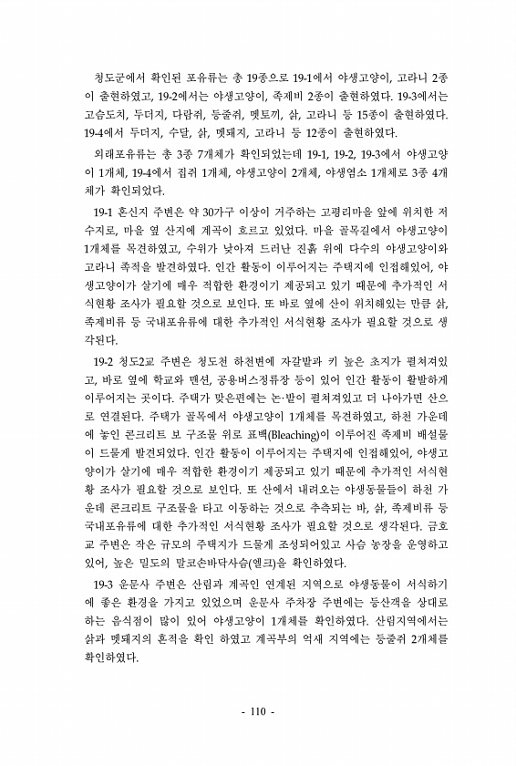 청도군에서 확인된 포유류는 총 19종으로 19-1에서 야생고양이, 고라니 2종 이 출현하였고, 19-2에서는 야생고양이, 족제비 2종이 출현하였다. 19-3에서는 고슴도치, 두더지, 다람쥐, 등줄쥐, 멧토끼, 삵, 고라니 등 15종이 출현하였다. 19-4에서 두더지, 수달, 삵, 멧돼지, 고라니 등 12종이 출현하였다. 외래포유류는 총 3종 7개체가 확인되었는데 19-1, 19-2, 19-3에서 야생고양 이 1개체, 19-4에서 집쥐 1개체, 야생고양이 2개체, 야생염소 1개체로 3종 4개 체가 확인되었다. 19-1 혼신지 주변은 약 30가구 이상이 거주하는 고평리마을 앞에 위치한 저 수지로, 마을 옆 산지에 계곡이 흐르고 있었다. 마을 골목길에서 야생고양이 1개체를 목견하였고, 수위가 낮아져 드러난 진흙 ...
