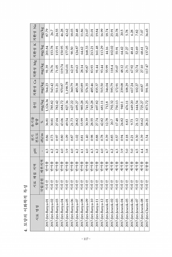토양의 이화학적 특성 시료 명칭 시료 채집 지역 전도도 전기 유기물 함량 총인 치환성 치환성 치환성 치환성 국립공원 세부지역 지리산 반야봉 지리산 반야봉 지리산 반야봉 지리산 반야봉 지리산 반야봉 지리산 반야봉 지리산 반야봉 지리산 반야봉 지리산 반야봉 지리산 반야봉 지리산 반야봉 지리산 반야봉 지리산 제석봉 지리산 제석봉 지리산 제석봉 지리산 제석봉 지리산 제석봉 지리산 제석봉 지리산 제석봉 지리산 제석봉 지리산 천왕봉 117