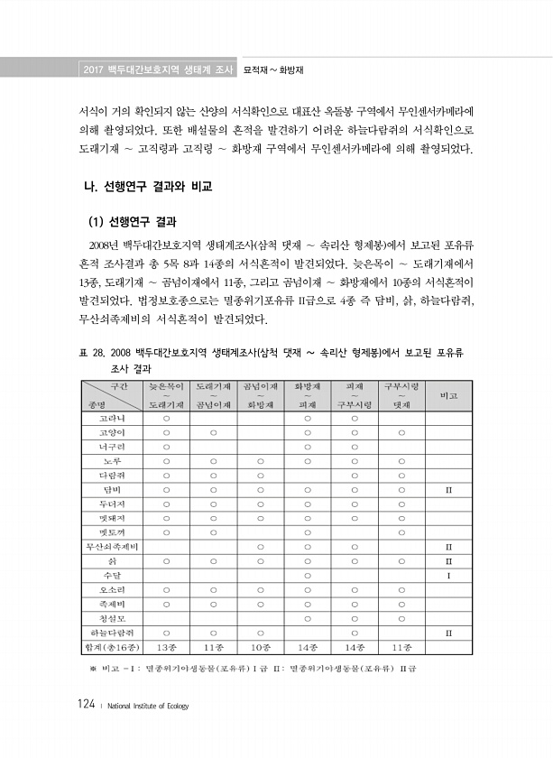 2017 백두대간보호지역 생태계 조사 묘적재 화방재 124 ? National Institute of Ecology 서식이 거의 확인되지 않는 산양의 서식확인으로 대표산 옥돌봉 구역에서 무인센서카메라에 의해 촬영되었다. 또한 배설물의 흔적을 발견하기 어려운 하늘다람쥐의 서식확인으로 도래기재 ∼ 고직령과 고직령 ∼ 화방재 구역에서 무인센서카메라에 의해 촬영되었다. 나. 선행연구 결과와 비교 1 선행연구 결과 2008년 백두대간보호지역 생태계조사 삼척 댓재 ∼ 속리산 형제봉 에서 보고된 포유류 흔적 조사결과 총 5목 8과 14종의 서식흔적이 발견되었다. 늦은목이 ∼ 도래기재에서 13종, 도래기재 ∼ 곰넘이재에서 11종, 그리고 곰넘이재 ∼ 화방재에서 10종의 서식흔적이 발견되었다. 법정보호종으로는 멸종위기포유류...