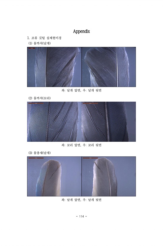 114 Appendix 1. 조류 깃털 실체현미경 1 물까치 날개 좌날개 앞면, 우날개 뒷면 2 물까치 꼬리 좌꼬리 앞면, 우꼬리 뒷면 3 물총새 날개 좌날개 앞면, 우날개뒷면