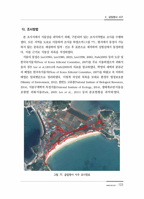 Ⅱ. 금일명사 사구 www.nie.re.kr ? 123 다. 조사방법 본 조사지에서 식물상을 파악하기 위해, 구분되어 있는 조사지역별로 조사를 수행하 였다. 모든 지역을 도보로 이동하여 조사를 하였으며 그림 77 , 현지에서 동정이 가능 하지 않는 분류군은 채집하여 압착·건조 후 표본으로 제작하여 실험실에서 동정하였 다. 이를 근거로 식물상 목록을 작성하였다. 식물의 동정은 Lee 1996 , Lee 1980, 2003 , Lee 1998, 2006 , Park 2009 등의 도감 및 한국속식물지 Flora of Korea Editorial Committee, 2007 를 주로 이용하였으며 귀화식 물의 경우 Lee et al. 2011 과 Park 2009 의 자료를 참고하였다. 학명의 채택과 분류군 의 배...