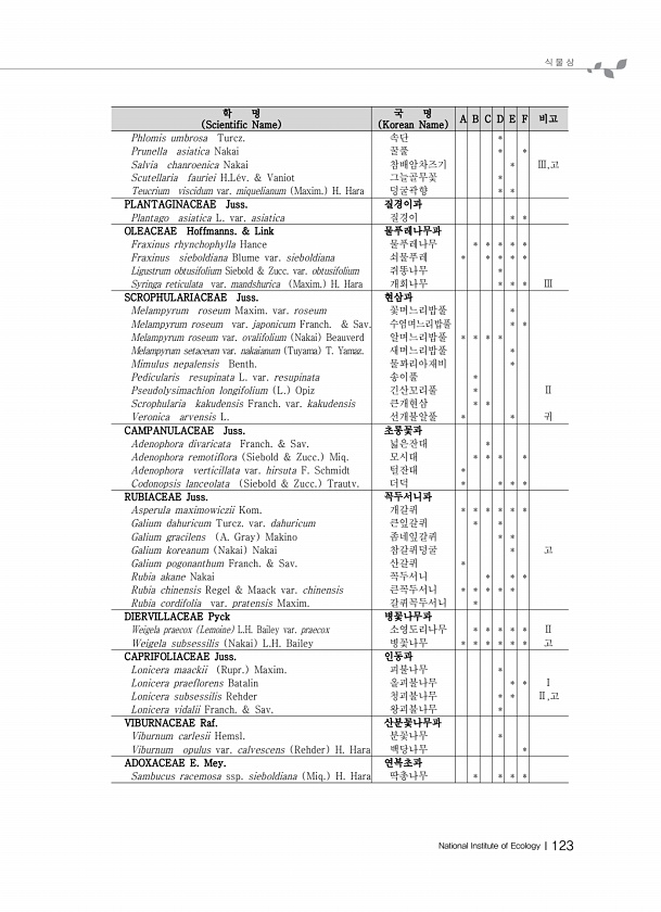 식 물 상 National Institute of EcologyⅠ123 학 명 Scientific Name 국 명 Korean Name A B C D E F 비고 Phlomis umbrosa Turcz. 속단 * Prunella asiatica Nakai 꿀풀 * * Salvia chanroenica Nakai 참배암차즈기 * Ⅲ,고 Scutellaria fauriei H.L?v. & Vaniot 그늘골무꽃 * Teucrium viscidum var. miquelianum Maxim. H. Hara 덩굴곽향 * * PLANTAGINACEAE Juss. 질경이과 Plantago asiatica L. var. asiatica 질경이 * * OLEACEAE Hoffmanns. & Link 물푸레나무과 Fraxin...