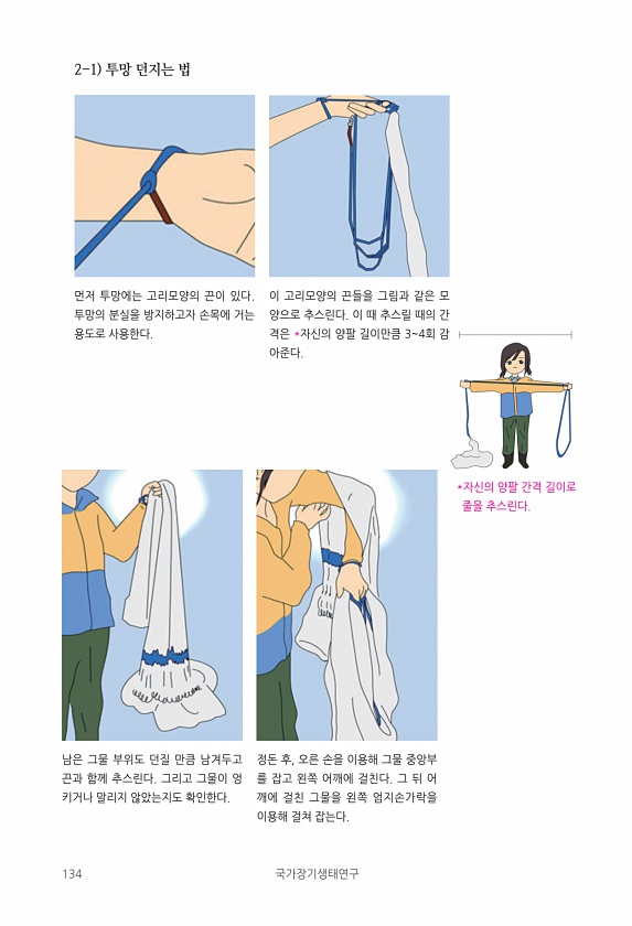 134 국가장기생태연구 *자신의 양팔 간격 길이로 줄을 추스린다. 2-1 투망 던지는 법 먼저 투망에는 고리모양의 끈이 있다. 투망의 분실을 방지하고자 손목에 거는 용도로 사용한다. 이 고리모양의 끈들을 그림과 같은 모 양으로 추스린다. 이 때 추스릴 때의 간 격은 *자신의 양팔 길이만큼 34회 감 아준다. 남은 그물 부위도 던질 만큼 남겨두고 끈과 함께 추스린다. 그리고 그물이 엉 키거나 말리지 않았는지도 확인한다. 정돈 후, 오른 손을 이용해 그물 중앙부 를 잡고 왼쪽 어깨에 걸친다. 그 뒤 어 깨에 걸친 그물을 왼쪽 엄지손가락을 이용해 걸쳐잡는다.