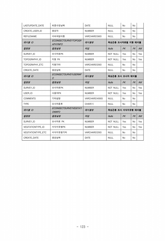 123 LASTUPDATE_DATE 최종수정날짜 DATE NULL No No CREATE_USER_ID 생성자 NUMBER NULL No No REFILENAME 서버파일이름 VARCHAR2 560 NULL No No 테이블 ID ECOINSECTSURVEYTOPOGR APHYINFO 테이블명 육상곤충 조사자료별 지형 테이블 컬럼명 컬럼설명 타입 Nulls PK FK INX SURVEY_ID 조사자료PK NUMBER NOT NULL Yes No Yes TOPOGRAPHY_ID 지형 PK NUMBER NOT NULL Yes No Yes TOPOGRAPHY_ETC 지형기타 VARCHAR2 200 NULL No No CREATE_DATE 생성날짜 DATE NULL No No 테이블 ID ECOINSECTSURVE...