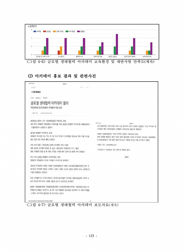 125 ?5차시 그림 4-6 글로벌 생태협력 아카데미 교육환경 및 제반사항 만족도 계속 2 아카데미 홍보 결과 및 관련사진 그림 4-7 글로벌 생태협력 아카데미 보도자료 계속
