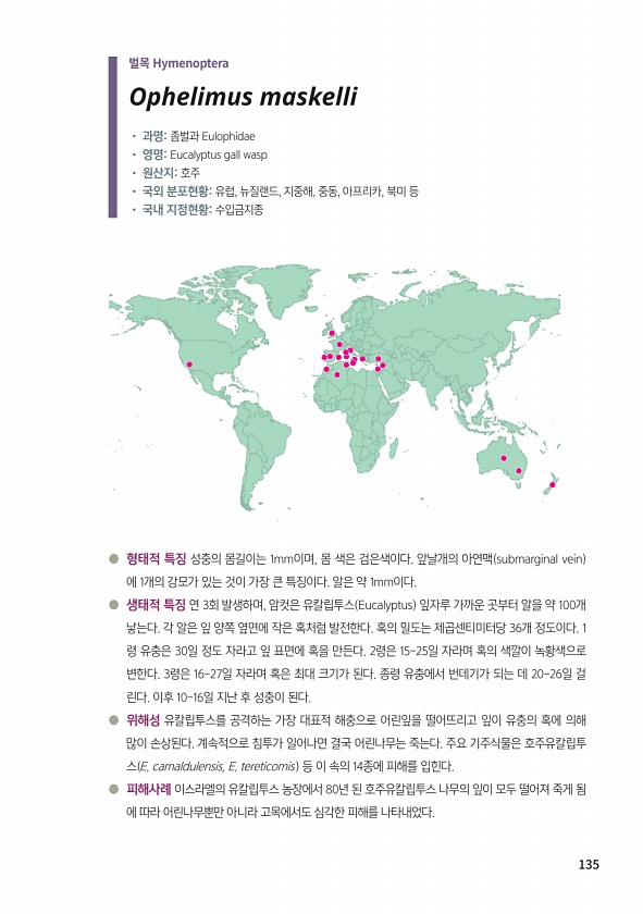 135 ● 형태적 특징 성충의 몸길이는 1mm이며, 몸 색은 검은색이다. 앞날개의 아연맥 submarginal vein 에 1개의 강모가 있는 것이 가장 큰 특징이다. 알은 약 1mm이다. ● 생태적 특징 연 3회 발생하며, 암컷은 유칼립투스 Eucalyptus 잎자루 가까운 곳부터 알을 약 100개 낳는다. 각 알은 잎 양쪽 옆면에 작은 혹처럼 발전한다. 혹의 밀도는 제곱센티미터당 36개 정도이다. 1 령 유충은 30일 정도 자라고 잎 표면에 혹을 만든다. 2령은 15-25일 자라며 혹의 색깔이 녹황색으로 변한다. 3령은 16-27일 자라며 혹은 최대 크기가 된다. 종령 유충에서 번데기가 되는 데 20-26일 걸 린다. 이후 10-16일 지난 후 성충이 된다. ● 위해성 유칼립투스를 공격하는 가장 대표적 ...