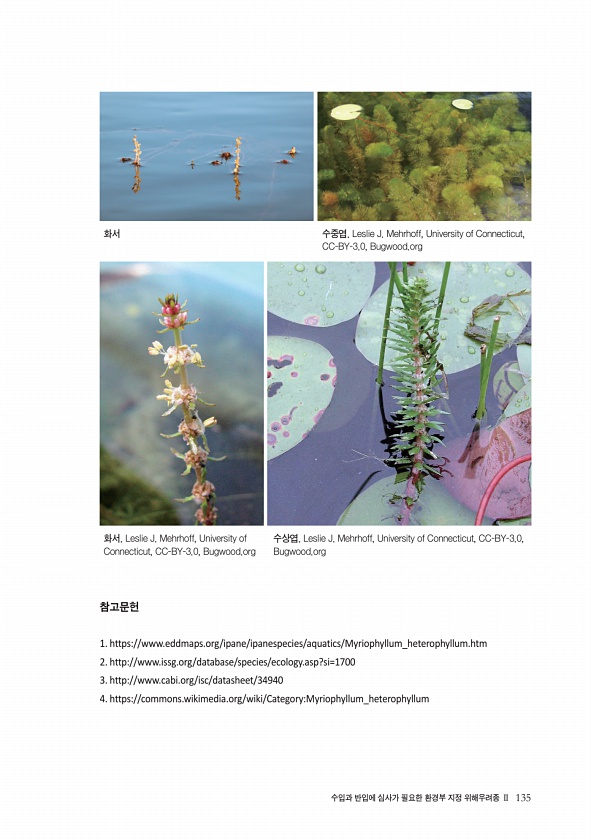 수입과 반입에 심사가 필요한 환경부 지정 위해우려종 Ⅱ 135 화서 수중엽. Leslie J. Mehrhoff, University of Connecticut, CC-BY-3.0, Bugwood.org 화서. Leslie J. Mehrhoff, University of Connecticut, CC-BY-3.0, Bugwood.org 수상엽. Leslie J. Mehrhoff, University of Connecticut, CC-BY-3.0, Bugwood.org 참고문헌 1. https//www.eddmaps.org/ipane/ipanespecies/aquatics/Myriophyllum_heterophyllum.htm 2. http//www.issg.org/database/species/ecology.a...