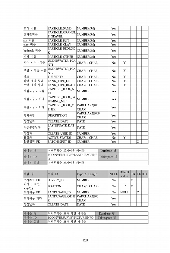 123 모래 비율 PARTICLE_SAND NUMBER 3,0 Yes 잔자갈비율 PARTICLE_GRANUL E_GRAVEL NUMBER 3,0 Yes slit 비율 PARTICLE_SLIT NUMBER 3,0 Yes clay 비율 PARTICLE_CLAY NUMBER 3,0 Yes bedrock 비율 PARTICLE_BEDROC K NUMBER 3,0 Yes 기타 비율 PARTICLE_OTHER NUMBER 3,0 Yes 정수 침수식물 UNDERWATER_PLA NT1 CHAR 1 CHAR No 1부엽 부유 식물 UNDERWATER_PLA NT2 CHAR 1 CHAR No 3탁도 TURBIDITY CHAR 1 CHAR No 1좌안 제방 형태 BANK_TYPE_LEFT CHAR 1 CHAR No 1우안 제방...