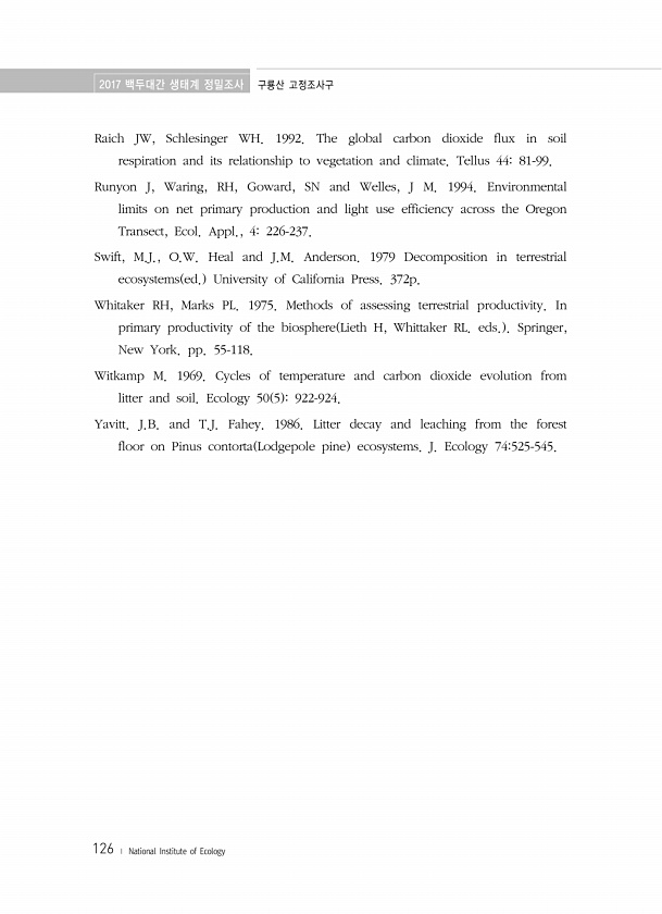 2017 백두대간 생태계 정밀조사 구룡산 고정조사구 126 ? National Institute of Ecology Raich JW, Schlesinger WH. 1992. The global carbon dioxide flux in soil respiration and its relationship to vegetation and climate. Tellus 4481-99. Runyon J, Waring, RH, Goward, SN and Welles, J M. 1994. Environmental limits on net primary production and light use efficiency across the Oregon Transect, Ecol. Appl., 4226-237. Swift, M....